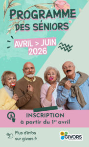 Les inscription pour les activités d’avril à juin 2026 démarrent à partir du 1er avril 2026, au service séniors du CCAS situé en cette période exceptionnellement au rez-de-chaussée de la maison du fleuve Rhône, aux horaires d’ouverture ou par téléphone au 04 72 49 18 25.